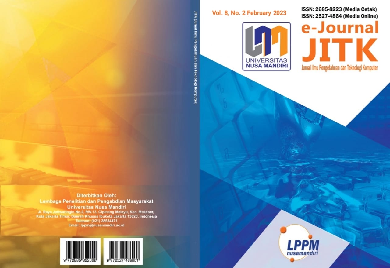 JITK (Journal of Computer Science and Technology) Volume 8 Number 2, published in February 2023, is a Journal published by the Center for Research and Community Service (LPPM) Universtias Nusa Mandiri. Frequency of Mid-Year Issuance (2 times a year, ie February and August). JITK has ISSN: 2685-8223 (Print Media) and ISSN: 2527-4864 (Online Media). DOI Prefix: 10.33480. JITK Journal contains a collection of topics relating to the collection/accumulation of new knowledge, empirical observations or research results, and the development of new ideas or proposals in the field of science related to computer science.